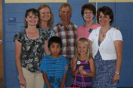 2011 East Millsboro Elementary School first grade Kiwanis Terrific Kids Leapster winners (front, left to right) Alex Velasquez-Escalante and Courtney Breneman. Back row, left to right: Teacher Kellie Hall, Millsboro Kiwanis Club members Darlene Phillips and Scott Phillips, Kiwanis Division 11 Lt. Governor Marianne Smith, and teacher Tracey Marvel.
