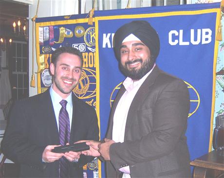 MVKC President Kahan Dhillon presents hypnotist Jason Linett with a Kiwanis pen as a token of appreciation for his fascinating talk on his specialty.