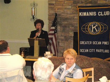 Pictured is Worcester County Commissioner, Judy Boggs, who was the guest speaker at the February 16th evening meeting of the Kiwanis Club of Greater Ocean Pines - Ocean City held at The Woodlands in Ocean Pines. Commissioner Boggs presented information on State and County issues effecting her constituency. She will also address these issues at her Town Hall Meeting on Saturday February 26th at 10 AM in the Ocean Pines Library.