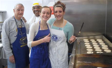 Two Key Clubbers, (L to R front Jenna Abbaticchio and Ali McLoota wanted to learn how to flip the flapjacks so they worked in the kitchen on the grill under the supervision of Kiwanian "flippers" (L to R rear) Bud Breidenstein and Ralph Chinn.