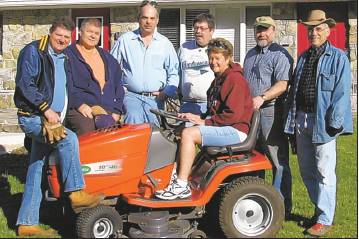 The Kiwanis Club of Suburban Frederick recently donated a muchneeded yard tractor to Hope Alive, a facility for homeless women and children in Sabillasville. The tractor was donated to the club by a member, Tracy Bemiller. After delivering the tractor, members of the club helped with chores, including turning the playground mulch, organizing the storage shed, stacking lumber and trash removal. Pictured, from left, are Bill Muffi, Eric Gatrell, Phil Pople, Terry Proescholdt, Dave Maloney, Frank Parker, club members; and seated on tractor, Sue Oehmig, executive director of Hope Alive.