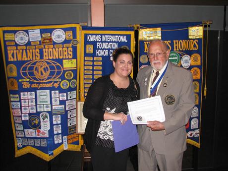 The Kiwanis Club of Mercury 64 celebrated the 48th anniversary of its chartering by establishing the E.Frank Dulong Scholarship. This annual $500 grant will go to a Hampton, Virginia School System teacher's assistant who is in Hampton's 'First Step' program. First Step aids those working in the school system who aspire to become teachers. Pictured above are Sara Sager, Mercury 64 President, and E. Frank Dulong.