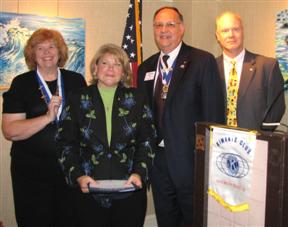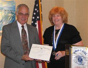 Club President Rosemary Cummings, after recognizing the eleven 2007-08 Kiwanians of the Month, announced James Kunkle as Kiwanian of the Year. Lt. Gov. Allan Kujala then officiated at the installation of officers and directors for 2008-09. Gov Riley and LTG Kujala rounded out the evening's festivities with an impressive induction of new member, Julie Beebe. Ms. Beebe said, "her induction as part of the 80th Anniversary ceremonies would be memorable for her".