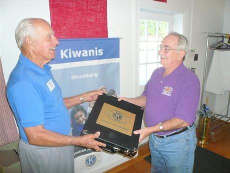 Doug Butler, Secretary of the Kiwanis Club of Old Town , Winchester, (VA) presents to Treasurer Phil Loving of the Kiwanis Club of Strasburg (VA) a special designed Kiwanis name tab case as a gift from the Old Town, sponsoring club.