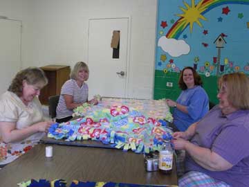 On July 8th the Kiwanis Club of LaPlata met to work on a "Young Children: Priority One" project. We chose to make double-sided fleece tag blankets to give to children who will have an extended stay at Civista Medical Center, our local hospital. In attendance were club members, Judi Gorney, Linda Parong, Emily Ferren, Linda Kandel, Dawn Roach, her daughter, Courtney Roach, Melody Stahl, her daughter, Chelsea Stahl, who is LaPlata High School's Key Club President, and Terri Osborne. Working together, we made eight blankets that will undoubtedly help to comfort some children. As you can see from the pictures, it was a successful project. We will be presenting the blankets to a Civista Medical Center representative at a future meeting.
