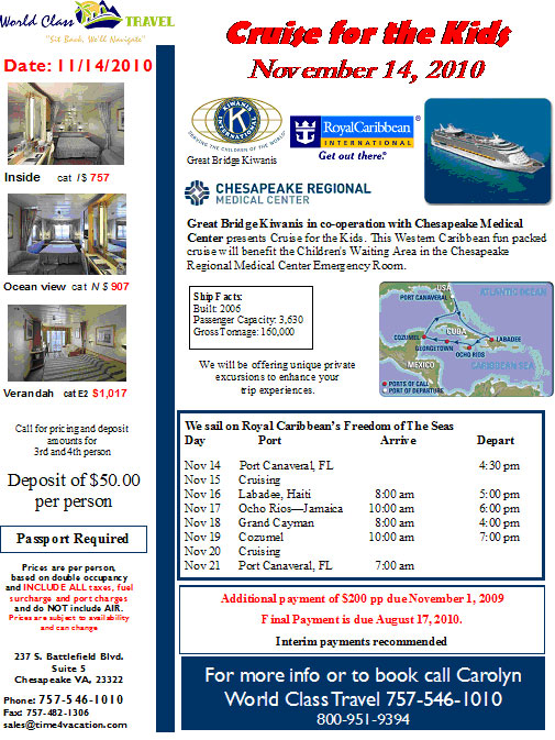 Kiwanis Club of Great Bridge and Chesapeake Regional Medical are teaming up for the "Cruise for the Kids". The Cruise for the Kids is a fundraising cruise to pay for the new children's section of the hospital's emergency room. With it's state of the art activities children will now have a place to wait that is dedicated to just them. Please join us as we sail to the Western Caribbean on November 14, 2010. Check out the flyer! For additional information, please contact