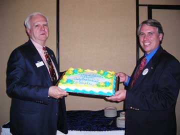 Governor Tom Ganse and the Kiwanis Club of St. Mary's County presented newly-elected Kiwanis International Trustee Jerry Peuler with a congratulatory cake at the July 21 Division 22 Council Meeting. Trustee Jerry is a member of the Waldorf Club in Division 22. He received standing ovations several times and explained his role on the International Board of Trustees. As KI Trustee, Jerry will be counselor to the Kentucky-Tennessee District and the Netherlands District.