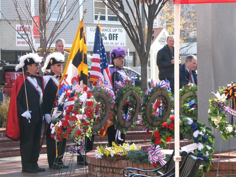 At precisely 11:00 AM, on the eleventh day of the eleventh month, ninety years after the armistice ending World War I in 1918, the Presentation of Colors was made by the Knights of Columbus Color Corps, and the National Anthem was sung movingly by Scott Forbes, Montgomery County Fire and Rescue Service. The Pledge of Allegiance was led by Eric Myrland, Post Commander of the American Legion. Then, in silence, the half staffing of our beautiful American Flag was performed by Hank Sanders, American Legion Post #105 Chaplin and World War II veteran. With the music, the solemn nature of the proceedings, the vibrant colors of the flags, wreathes, and performers it was indeed a colorful and moving ceremony.