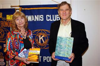 (Right, award-Winning author and artist Mary Montague Sikes shows off several of her books, assisted by her husband (and West Point Kiwanis member) Olen Sikes.)