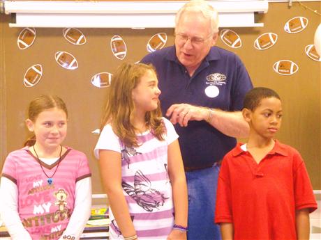 On Tuesday October 26th at the second meeting of the year, Al Kastner, Kiwanis Club liaison of the parent Kiwanis Club of Greater Ocean Pines-Ocean City to local school Kiwanis Clubs, is pictured installing officers of the Buckingham Elementary School K-Kids, the Kiwanis Club at the elementary school level. (L to R) Secretary Kayla Parker, Treasurer Kasey Donaway.Al Kastner, VP Jalen Planter. President Erica Webb was not able to attend. Twenty-three students and two teacher advisors, Debbie Wooten and Julie Young, comprise the BES K-Kids Club.