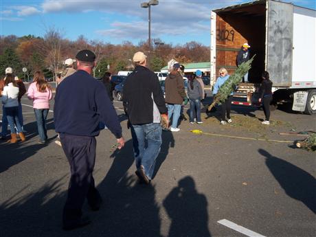Kiwanis Capital District Governor-Elect Jeff Wolff offloads a tree to MVKC's Co-Secretary, Joanne Malkin, while MVKC members and Kiwanis student club helpers line up to carry theirs to the awaiting sales racks