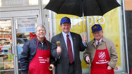 US Senator Coons, a Wilmington Kiwanian, rings the Salvation Army bell! Us Senator Coons is seen flanked by (L - R) Wilmington's Past President Dave Wilson and President John Sheridan as they ring the bell in the rain for The Salvation Army kettle in downtown Wilmington, DE! Kiwanians manned the Bells from 9:00am to 4:00pm. It is said that Senator Coons, a Kiwanian for 4 years now, "lobbied" many attorneys and judges to add to "The Salvation Army Kettle".... And, how often do we see a US Senator standing in the rain helping out a charity? Well, he's a true Kiwanian!