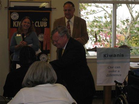 Wilmington, DE Kiwanis Charters a New Aktion Club at the Hillside Nursing Center. Wilmington, De Kiwanis Club President, John Sheridan is shown pinning the Aktion Club President's pin on Aktion Club President, Juanita Baughn in the chartering ceremony at The Hillside Nursing Center in Wilmington, DE. Standing in the background are Lt. Gov. Pat Justice and Aktion Club Administrator, Art Riley, both of whom welcomed The Hillside Nursing Center Aktion Club into The Kiwanis Family. Off the ground in a hurry, the Aktion Club's first project is making stuffed animals for the children at nearby A.I. DuPont Childrens' Hospital for Christmas.!