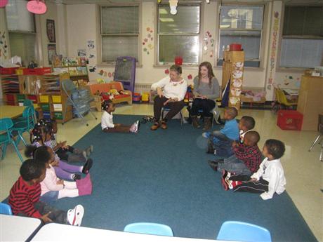 Wilmington, DE Kiwanians Read To Tots. Kiwanian, Pat Bartoshesky and Key Clubber, Evie Stevens are two of the volunteers shown reading to pre school children at the downtown branch of The Salvation Army in Wilmington. The club also gives the tots books to take home!