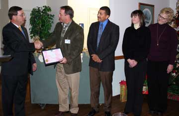 Builders Club is the largest service organization for middle school students (ages 12 to 14), with more than 40,000 members worldwide. The first Builders Club was chartered in 1975. Today, there are more than 2,000 clubs in Aruba, Australia, Bahamas, Barbados, Bermuda, Canada, Italy, Jamaica, Korea, Martinique, Netherlands Antilles, Philippines, Suriname, Trinidad & Tobago, and the United States. Builders Club is a "student-led" community service organization, which operates under school regulations and draws its members from the student body. Community-based Builders Clubs also may be established at community facilities such as: churches, libraries, YMCA's, or lodges. Builders Club is unique because a Kiwanis club, composed of leading business and professional people of the community, serves as the club's sponsor. Builders Club is structured only on the local club level but is supported by the Kiwanis International Office in Indianapolis, Indiana, which provides programs, literature, and opportunities to relate to teenagers from countries all around the world! This meeting also served as a membership meeting, and several guests and prospective members attended. (Pictured Kiwanis President Jim Barnes presents builders club charter to SMS Principal Joe Glick, Assistant Principal Luke Hartman and Co-Advisors Diane Secord and Kathy Holter.)