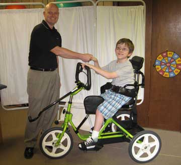The Kiwanis Club of Chesterfield's Immediate Past President Neal Robertson presented Jack Coombs with a customized Rifton tricycle. He is a sixth grader with cerebral palsy who attends Bailey Bridge Middle School in Chesterfield County, The tricycle will assist him with his physical therapy and allow him with much greater mobility. The Chesterfield Club became involved at the request of Jack's mother, Sandra, after she had exhausted all efforts to get their health insurance company to cover the cost.