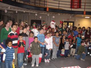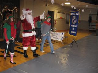 (Above) CKI at UVA Hosts Breakfast with Santa. The CKI chapter at the University of Virginia hosted its second annual Breakfast with Santa party for the children of the Boys and Girls Club in Charlottesville and Albemarle County on a beautiful snowy Saturday morning in early December. Upwards of 150 children and their parents and Boys & Girls Club leaders enjoyed a delicious breakfast, played hours of games and activities, and, of course, visited with Santa who had a present for every boy and girl who came to see him. Pictured is past president of the Charlottesville Kiwanis Club, Philip Day, making his grand entrance flanked by two elves from CKI at UVA. The event was held in UVA's venerable "Mem Gym" and was catered by UVA's Dining Services. More than 40 CKI members and 9 Key Clubbers lavishly decorated the large hall and conducted more than two dozen activity stations, including a basketball court and a cake walk.