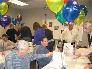 (Above) Charlottesville Service Night at Hospice. At their monthly service night in January, two dozen Charlottesville Kiwanians along with four members of CKI at the University of Virginia pitched in to help the Hospice of the Piedmont get ready for their gala thirtieth anniversary celebration. Pictured in the foreground are Kiwanians Gene Colligan , David Stackpole, and Anthony Hastoglis compiling 300 information packets under the able direction of membership chair Bob Pflugfelder. Kiwanis has designated Hospice of the Piedmont as the beneficiary of their 6th annual Dogwood Pancake Breakfast scheduled for April 24. Hospice offers a unique program called Journeys, where, throughout the year, grief support groups for children and teens are facilitated by registered art therapists and bereavement counselors who use art and other creative means to help children express their inner feelings.