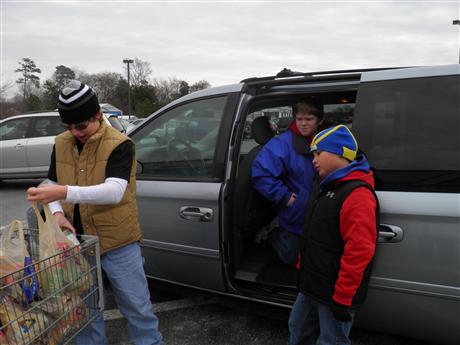 Builder Colt Daniels and K-Kids John Stubbs and Cruz Harmon load food in van