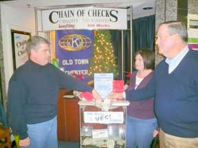 Tom Hoy,(left) President of the Kiwanis Club of Old Town (Winchester,Va) makes a donation with David Burks to the Chain of Checks collection container at the Apple Blossom Mall in Winchester. Club member Renee Wells witness the donation. The money collected will be used to promote the Winchester Aktion Club. |