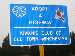 New Adopt-A-Highway signs will show up on Virginia Route 50 East as the results of an agreement finalized by the Virginia Department of Transportation and the Kiwanis Club of Old Town (Winchester,Va). The Club will schedule quarterly clean ups in the designated area. |