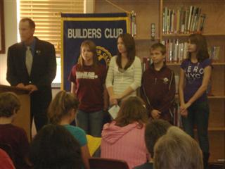 (Above) On December 9th the Kiwanis Club of Poquoson inducted 24 new members into the Poquoson Middle School Builders Club. The Club has been in existence since 2000 and now has over sixty members. Pictures shows Kiwanis President Walt Burns, accompanied by Builders Club Officers, addressing teachers and parents at the ceremony. The festivities were finished off with cake and ice cream in the school cafeteria.