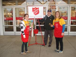 (Above) During the week of December 7th thru 11th, the Kiwanis Club of Poquoson teamed with the Poquoson High School Key Club to Man the Red Kettles and Ring the Bells for the Salvation Army, in front of two local food stores. While the "OLD " Kiwanians mostly watched, the young Key Clubbers danced and sang Christmas Carols to entertain the shoppers -- also to keep warm. Overall, the Poquoson Kiwanis Club and its sponsored Key Club donated well over 200 man hours to help the Salvation Army in its humanitarian endeavors