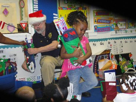 Great Bridge Kiwanis and Santa's helper Secretary Bob Powers distributes stockings at E R Jones.