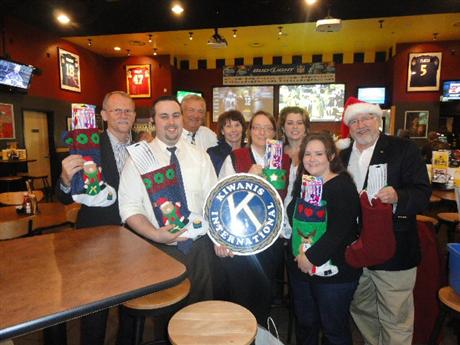 Usually, we meet at someone's home for a potluck and during the evening we fill stocking for the children at the two HeadStart classrooms where we have our Reading is Fundamental program. This year, to generate awareness of Kiwanis in our community, we went public. The party was held at a Buffalo Wild Wings and when we finished eating, we set up the assemble line in the center of the restaurant and filled the stockings.