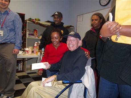 MVKC member Bruce Malkin awarding Wal-Mart gift certificate to SNC program participants with SNC Director Telesia Taylor-Boyd at his side.