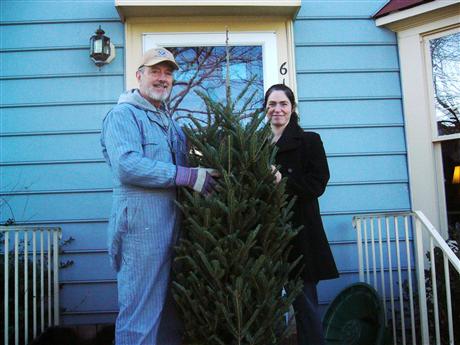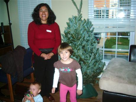 The wives are from left to right Elizabeth Harvey, Sara Calder, and Virginia Curtis. Each has their husband serving in Afghanistan. They are part of a group called Hearts Apart at Ft Belvoir. This is a group that meets once a month at Ft Belvoir where they can discuss their problems and seek comfort. They are fed a delicious meal and their children are cared for during the meeting. The photos show Mount Vernon member Rich Keil delivering the trees to their home.