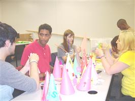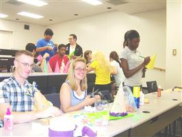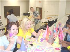 Students at the Alexandria campus of Northern Virginia Community College spent their Friday afternoon recently doing their first community service project while their fellow students watched the soccer World Cup match nearby. On June 11, after enjoying a hot dog and hamburger bar-b-q together, a dozen members of the newly chartered Kiwanis CKI Club at NOVACC went into the Biisdorf building and spent the next 2 hours creating colorful paper hats from paper and decorations purchased for this project. The resulting creations will be personally delivered by these thoughtful students to children who are patients in the area's hospitals. Led by Club President "Ash" Elmelik and VP Ryan Pierpoint, the group worked happily and steadily until a large supply of beautifully decorated fun hats were ready for delivery. The below photos show the hatmaking work in progress. The NOVACC CKI Club in Alexandria is sponsored by the Mount Vernon Kiwanis Club.  See www.mtvernonvakiwanis.org for more information on community service programs available in this region.