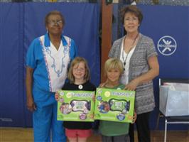 Kiwanian Marianne Smith and Long Neck Elementary second grade Terrific Kids Leapster winners Sharnae Harmon and Joseph Walker.