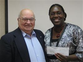 (Above) The Kiwanis Club of the Peninsula at Oyster Point supported the traffic awareness project which is aimed at making teenage drivers know what happens when drinking and driving turn into tragedy. A staged "accident" occurs near the high school and actors portray the reactions or family members and friends. It is a stark reminder of how a careless act can affect many lives. The Kiwanis Club of the Peninsula at Oyster Point made a donation of $200 to this project. MaRhonda Echols, right, victim's assistance advocate in the office of the Commonwealth's Attorney received the check from Chuck Root, Community Service chairman.