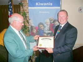 (Above) Division 19 News: Steven A. Schetrom II (left) newly elected President of the new Kiwanis Club of Strasburg (VA) receives congratulations from Division 19 Lt. Governor Dick Hoover during charting in June. the Kiwanis Club of Old Town (Winchester,VA) is the new Club's sponsor.