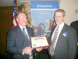 (Above) Kiwanis Club of Strasburg: Todd Drunagel (left) President of the sponsoring Kiwanis Club of Old Town, (Winchester, VA) presents the Charter of Organization to President Steven A. Schetrom II for the Kiwanis Club of Strasburg (VA) in June. The Club meets each Tuesday morning, 7:30 a.m. at the Strasburg United Methodist Church.