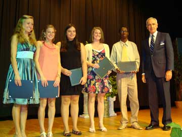 At the 2009 Stephen Decatur High School Scholarship Awards Program in May the Kiwanis Club of Greater Ocean Pines - Ocean City was part of the program presenting scholarships to deserving senior students to help them further their educations. The recipients are left to right, Lindsay Chetelat $2,000 scholarship winner, Erin McGuire, Emma Newell, Amanda Pfaff and Anthony Whaley each won a $1,500 scholarship. President-Elect of the Kiwanis Club, Dan Peletier, presented the awards.