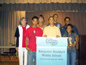 Kiwanis Club of Waldorf chartered Benjamin Stoddert Middle School Builders Club. Shown in the photograph are Millie Kriemelmeyer, Kiwanis advisor; Daylon Sims, secretary; Sue Delacruz, principal; Davis Mason, vice president; Dominique Edelen, treasurer, Carmencita Bell, faculty advisor; and Kiana Pitts, president.