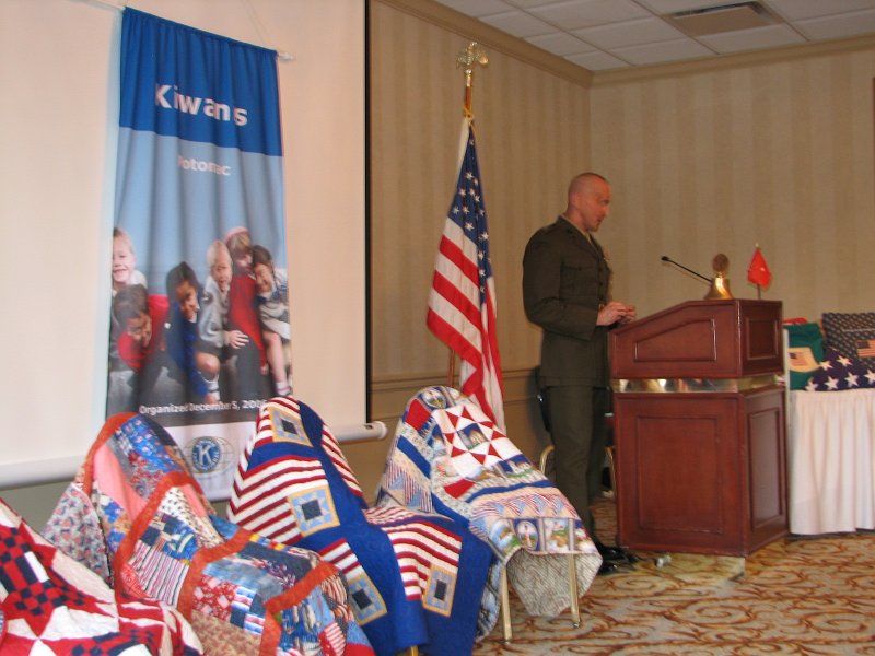 Kiwanis and the warriors are very appreciative of the special presentation of 'Quilts Of Honor' providing each warrior with a patriotic quilt, plus one for Brigadier General Simcock as a token of our appreciation for his remarks. The key MSP Quilting Angels supporting this are Suzanne Wade, formerly from Gaithersburg now living in Hemet, California, and Kathy Thorne from Germantown who coordinated the making and delivery of the quilts. This was started after September 11, 2001, and over 31,000 quilts for "Duty, Honor and Country" have been awarded to the men and women of our Armed Forces. We all thank you, quilters, for your generosity. They can be contacted at www.mspquiltingangles.org for more information … and your thanks.
