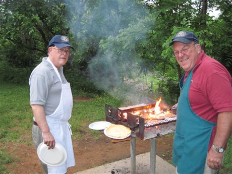 Once again this year, the Charlottesville Kiwanis Club scheduled their regular Monday evening meeting to take place at Pen Park so that members and their guests could cheer on the Kiwanis Little League team and then enjoy a tasty barbecue picnic in the nearby shelter.  The game was interrupted by lightning in the fourth inning with Kiwanis leading Big Jim's.  Kiwanians retreated to the shelter where, thanks to the grilling expertise of Charlie Krizek, Don Foss, and Norm Gutzler the hot dogs, hamburgers, and all the fixins were ready to be served.  When the skies opened up to a torrential downpour, the Kiwanians and their special guests, the head coach and his son, were all warm, dry, and well-fed.   A real treat is in store for any K-Family member who comes out to Pen Park to join the kids and their coaches and families as they heartily "cheer for Kiwanis."