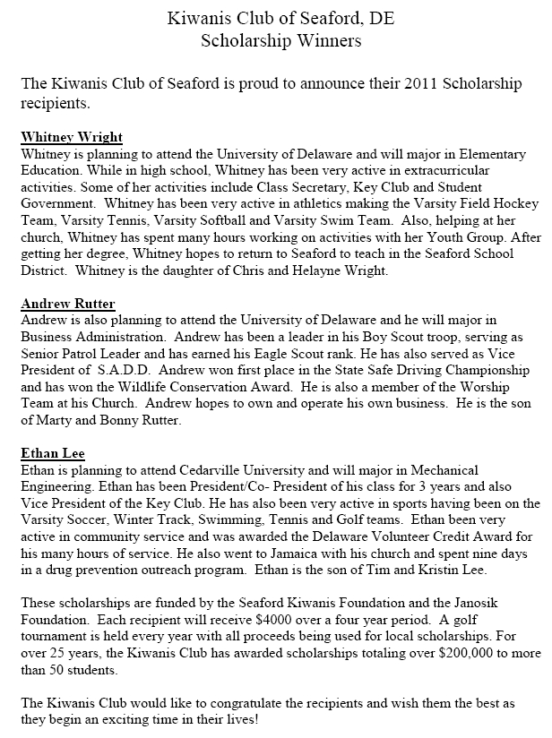 - Kiwanis Club of Seaford, DE Scholarship Winners