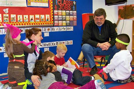 PCDC teacher Sharon Bantel looks on as Kiwanis volunteer Harry Whitt talks with Head Start children about the book he has just shared with them.