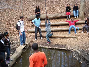 On April 9, 28 teenagers and 5 adult staff from the Creekside and Sacramento Neighborhood Centers enjoyed a full day of action activities at the GMU-owned Hemlock Overlook Park, where Outward Bound team-building challenges are the day's agenda. The teens successfully completed 6 difficult tasks that required them to plan team strategies ,work together to complete their tasks, and help one another succeed. The kids had a great time, laughing and urging one another on, until all of them succeeded in their group goals. This trip was made possible due to the sponsorship by the Mount Vernon Kiwanis Club.