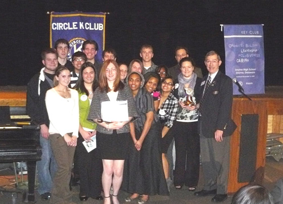 (Above) Pictured above are some of the Smyrna High School Key Club members with Club President Rosie Mujica (center holding Club charter) and Capital District Governor Don Dudey (far right) following the official charter presentation and installation of officers on March 3.