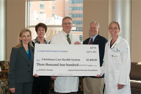 The Capital District Kiwanis Foundation made a generous $3,400 gift to the Pediatric Trauma Program to support their nursing education commitment and their purchase of pediatric medical equipment for several departments within the health system. Attending the check presentation are (from left) Linda Laskowski Jones, RN, MS, ACNS-BC, CEN, vice president, Emergency, Trauma and Aeromedical Services, Mark Cipolle, M.D., medical director, Trauma Program, Marianne Smith, Lt. Gov, Division 11 and Dale Collins, Trustee Delmarva Region, both of Capital District Kiwanis and Joan Pirrung, APRN, BC, Trauma Program Manager. The Capital District Kiwanis has provided more than 15 years of significant support to Christiana Care's pediatrics efforts