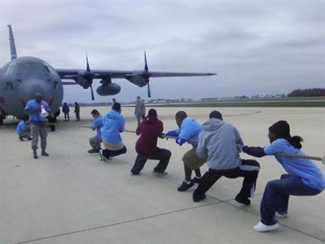 Members of the Wilmington Kiwanis and members of 2 of their 5 Key Clubs in April pulling a C-110 Air Force Transport plane in a fund raiser for Special Olympics. Wilmington Kiwanis with Key Clubs pulled the multi ton C-110 Transport 12 feet in 7.58 seconds! While this was not "good" enough for first place, it was "good" enough to help contribute to the $28,000 raised for Special Olympics at the New Castle National Guard Air Force Base in Delaware. "Good" job Wilmington! |