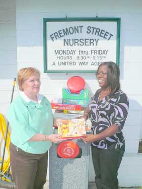 | Sue Barnett (left) a member of the Kiwanis Club of Old Town (Winchester, VA) delivers games and toys to Freda Roberson, Executive Director of the Freemont Street Nursery in Winchester as part of the Club's Youth Service program. | ![]() |