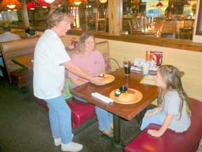 | Mary Nordman a charter member of the Kiwanis Club of Old Town, (Winchester, VA) serves pancakes to a customer during the annual Kiwanis Applebee's Pancake Day held each year. The Club participates with Applebee's each year as one of their Fund Raiser for community service. | ![]() |