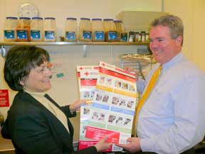| Pam Lamborne, a member of the Kiwanis Club of Old Town (Winchester, Va) presents a "Steps For Choking Emergencies" poster to Peter L. Labrecque, General Manager of Sodexho Campus Services at Shenandoah University. The posters, purchased from the American Red Cross, are being supplied to area restaurants by the Club's Personal Safety Committee. | ![]() |
