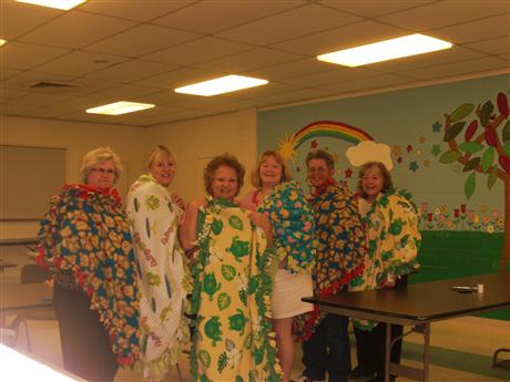 LaPlata Club YCPO Project: Blankets! On September 19, 2010, the Kiwanis Club of LaPlata met to work on a "Young Children: Priority One" project. This was our second annual blanket making day. We are planning on presenting our double-sided fleece tag blankets to Maureen Jenkins, from Civista Health Care's nursery again, this year. After presenting these blankets to her last year, they were then given to children who might have an extended stay at the hospital or to children who would not have a special blanket to come home to. We felt these children would be comforted and happy having one of our handmade blankets. In attendance were club members, Judi Gorney, Linda Kandel, (President Elect); Emily Ferren, (President); Melody Stahl, Sharon and John Reith, (Past President); and Gale Crooks. Working together, we made 14 blankets that will undoubtedly come in handy. As you can see from the pictures, it was a successful project. We will be presenting the blankets to Maureen Jenkins at a future meeting.
